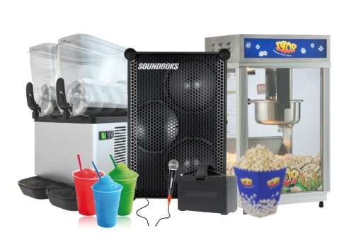 Komplet pakke med popcorn, slushice og Soundboks til 50 personer.Festpakken indeholder: