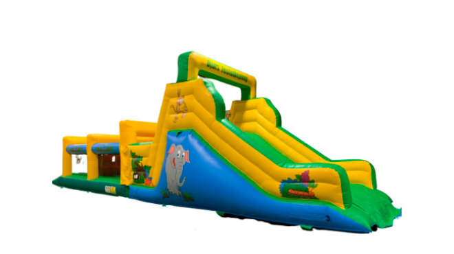 Hoppeborg rutsjebane med jungletema til børn og barnlige sjæle. Perfekt til fødselsdage, byfester, gadefester, kræmmermarkeder, messer og lignende. Du får en perfekt aktivitet til festen, som både underholder og beskæftiger både store og små børn. Hoppeborg rutsjebanen indeholder både rutsjebane og forhindringsbane, som kan udfordre alle brugere.